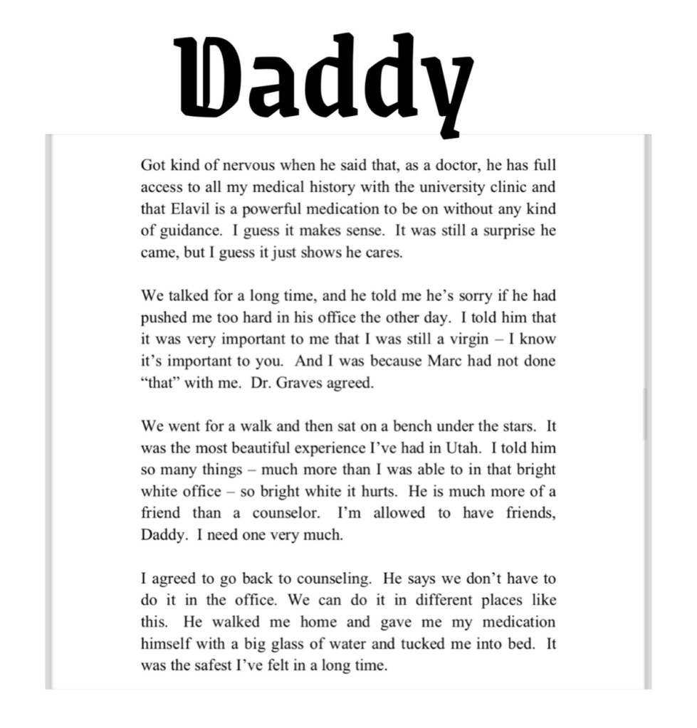 The title story of DADDY is a one-sided epistolary horror story set at a Christian college. A female student, sexual assault survivor writes emails to her father about the assault, the aftermath & a sinister figure who works his way into her traumatized heart.