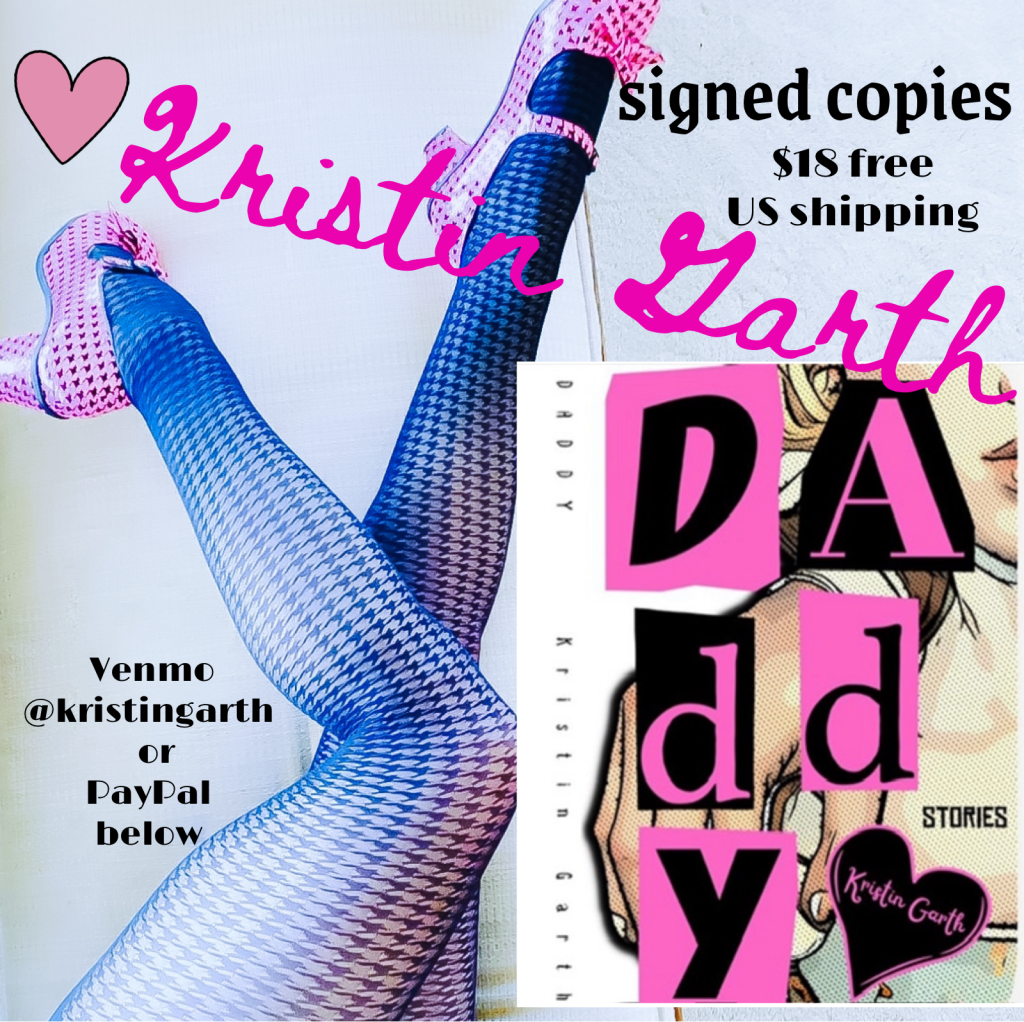 DADDY is a 183 pages of dark short stories and a novella all sharing the collective theme of a dark father figure absent or present, sometimes multiple characters. The stories and novella present characters struggling against and giving into their daddy issues. It was an extremely therapeutic book for a girl like me, with daddy issues she wears on her sleeves and kneesocks for the world to see, to write and bask in the extremes of where this pain can take you. The stories are set against the backdrop of a Christian university, strip clubs, roller skating rinks, suburban neighborhoods, Pensacon, Florida’s electric chair, a small town cable access station late night, a Parisian fashion show after party, a candy coated dream/nightmare, a kitty themed coffee shop, the rural woods of Northwest Florida, an elementary school bathroom stall and a child’s ornate playhouse among other locales. The book is published by Anxiety Press and will be available in October.