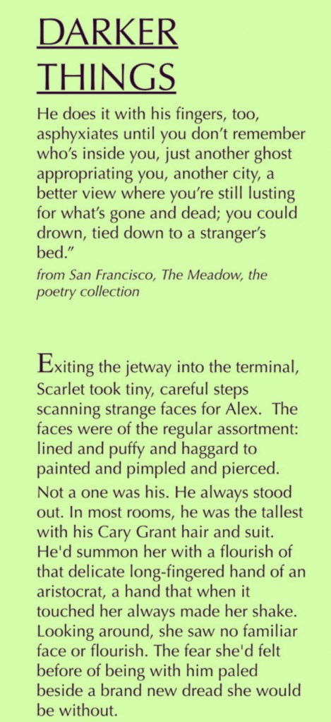 You will feel an ache that gives you pause. You will feel something that flutters in you like fear, then crawls like a moan. As you turn the page, you will whisper, like Scarlet, saying “I want this.”