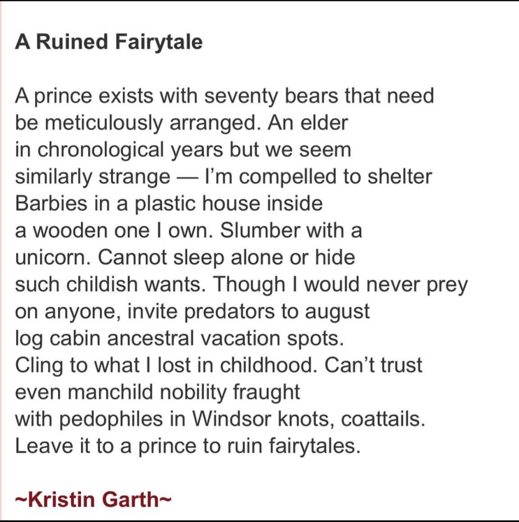 A Ruined Fairytale by Kristin Garth first published in Thirteen Myna Birds February 2022 Share this: Click to share on X (Opens in new window) X Click to share on Facebook (Opens in new window) Facebook Like Loading...