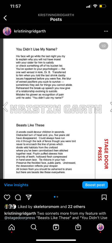 Beasts Like These & You Didn’t Use My Name by Kristin Garth Share this: Click to share on X (Opens in new window) X Click to share on Facebook (Opens in new window) Facebook Like Loading...