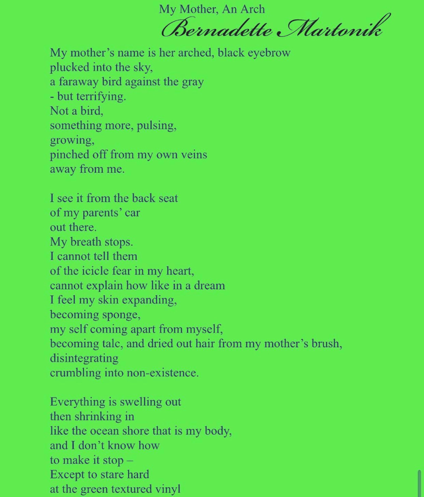 My Mother, An Arch by Bernadette Martonik Share this: Click to share on X (Opens in new window) X Click to share on Facebook (Opens in new window) Facebook Like Loading...