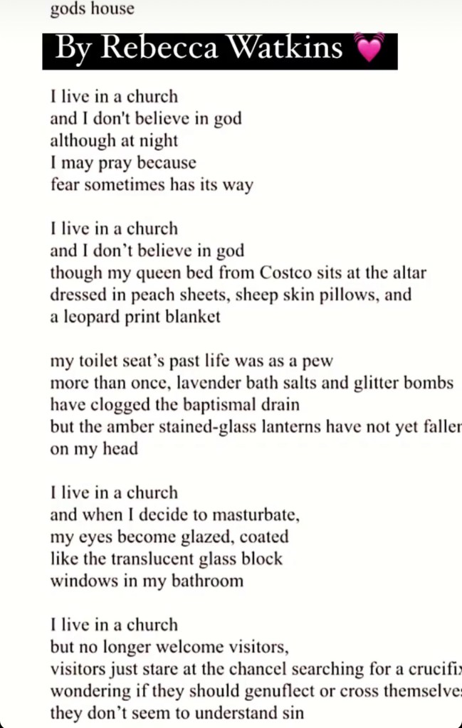 gods house by Rebecca Watkins Share this: Click to share on X (Opens in new window) X Click to share on Facebook (Opens in new window) Facebook Like Loading...