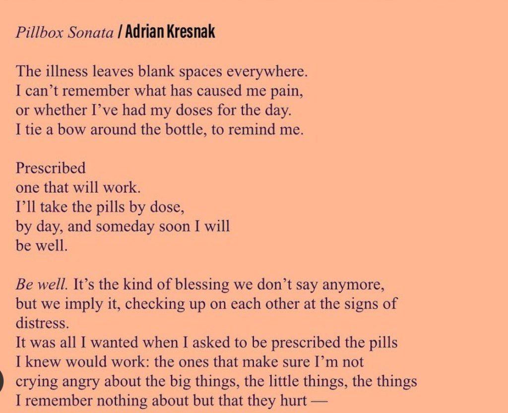Pillbox Sonata by Adrian Kresnak Share this: Click to share on X (Opens in new window) X Click to share on Facebook (Opens in new window) Facebook Like Loading...