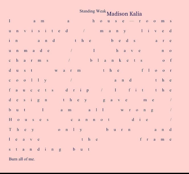 Standing Weak by Madison Kalia Share this: Click to share on X (Opens in new window) X Click to share on Facebook (Opens in new window) Facebook Like Loading...
