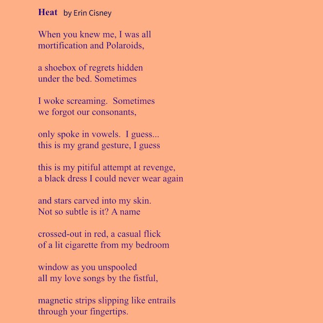 Heat by Erin Cisney Share this: Click to share on X (Opens in new window) X Click to share on Facebook (Opens in new window) Facebook Like Loading...