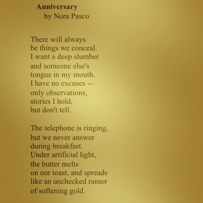 Nora Pasco is 38 years old and enjoys her career as a nurse tech and her life as a mother to a fantastic little boy. She writes poetry as a spiritual practice. She is grateful always to her teachers and family who have been a source of constant encouragement and inspiration to her since she began writing as a child. She is currently completing her degree in Human Services and hopes to merge her poetry with advocacy and social justice work in the future.