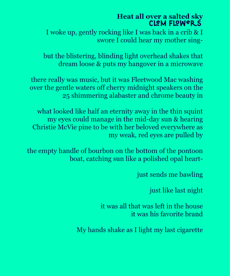 Heat all over a salted sky by Clem Flowers Share this: Click to share on X (Opens in new window) X Click to share on Facebook (Opens in new window) Facebook Like Loading...