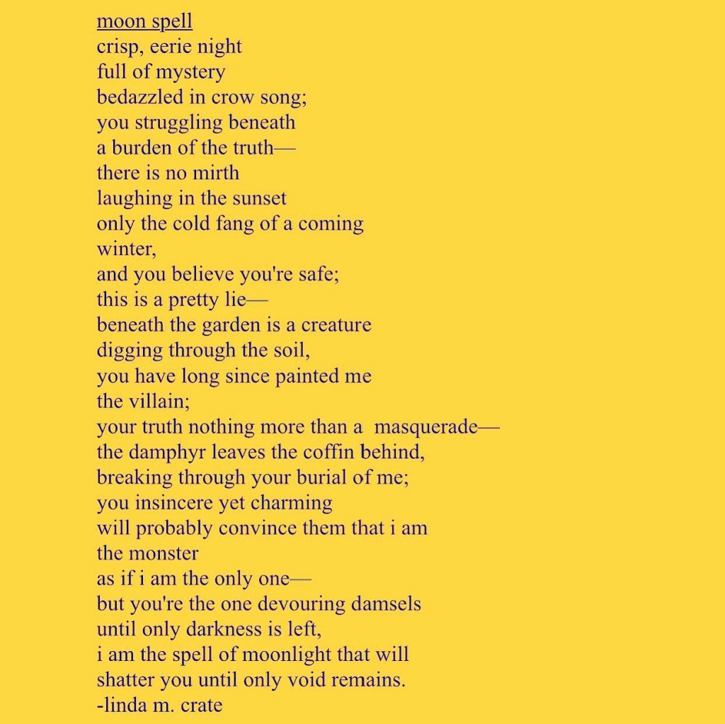 moon spell by linda m. crate Share this: Click to share on X (Opens in new window) X Click to share on Facebook (Opens in new window) Facebook Like Loading...