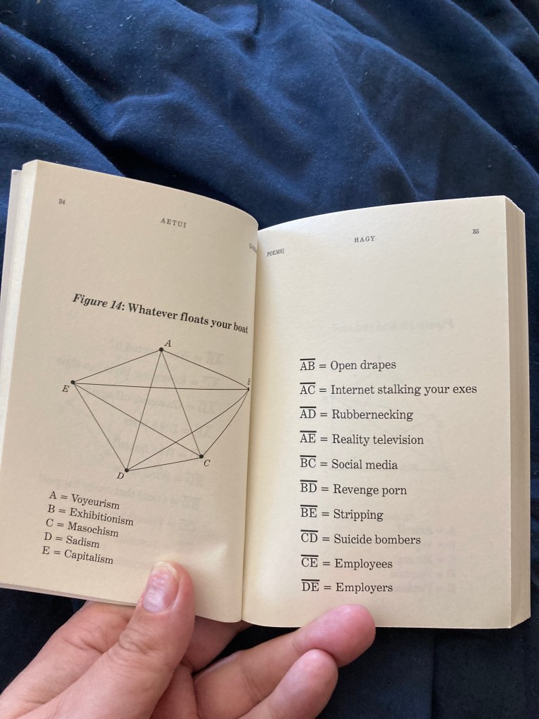 AETUI by Jessica Hagy, the cartoonist and blogger known for creating whimsical and insightful Venn diagrams and graphs on the popular website Indexed, is light years away from that in content but the format reminds me of those joke books. The book is small and the 110 entries all have a more or less repeated morphology: a misshapen stretched pentagram, and underneath that, a simple list of five simple word-concepts corresponding to the points of the pentagram, then the facing page shows another list, of ten line-segments that illustrate some relationship between the concepts or words in the pentagram.