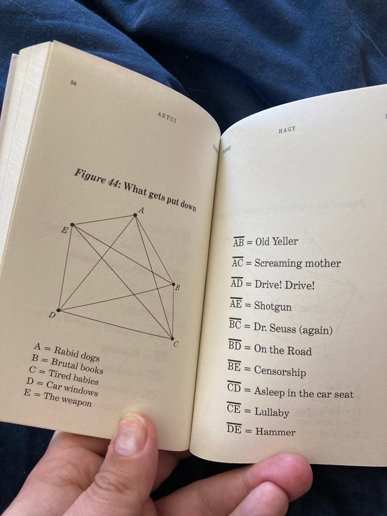 Elsewhere the interconnections in the diagrams are not as clear, and this is where the material of the book veers into an area that may be deemed more poetic. The pathways of associations that Hagy opens up in her lists can jar us out of linguistic complacency the way a poem can. In figure 44, “What gets put down,” with A = Rabid dogs, B = Brutal books, C = Tired babies, D = Car windows, E = The weapon, we are shown with AE the shotgun used to end a rabid dog’s misery, and with BE how censorship may be a weapon to kill brutal books, but to think of CE, “a lullaby” as a weapon against tired babies takes us aback for a second. The magic trick of the book is to show how words have a multiplicity of meanings and shadings when combined with other words. I couldn’t quite make out the significance of the title, AETUI — no matter, it is all part of a gently forbidding esoteric package that doesn’t need to be delved into too deeply, like a cartoon imp protecting a doorway to a secret library.