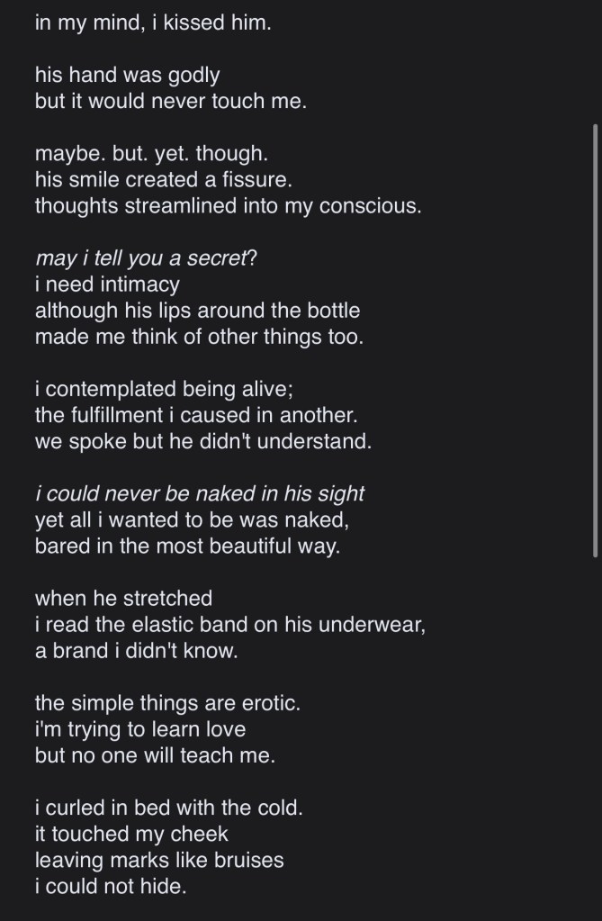 [i pretended that he liked me] by John Compton Share this: Click to share on X (Opens in new window) X Click to share on Facebook (Opens in new window) Facebook Like Loading...