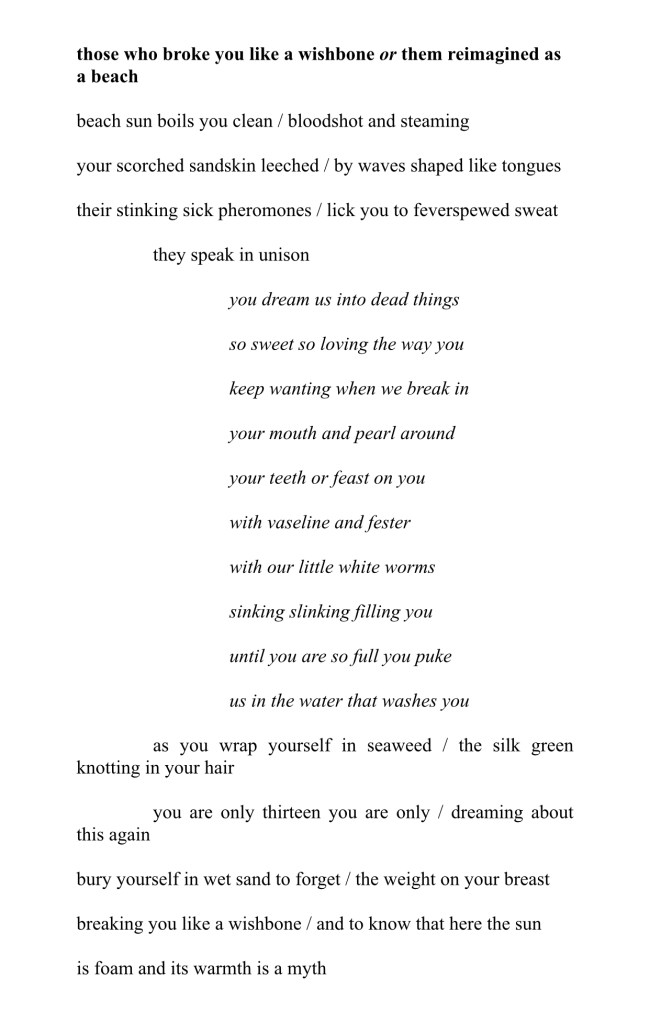 those who broke you like a wishbone or them reimagined as a beach by Rachael Crosbie Share this: Click to share on X (Opens in new window) X Click to share on Facebook (Opens in new window) Facebook Like Loading...