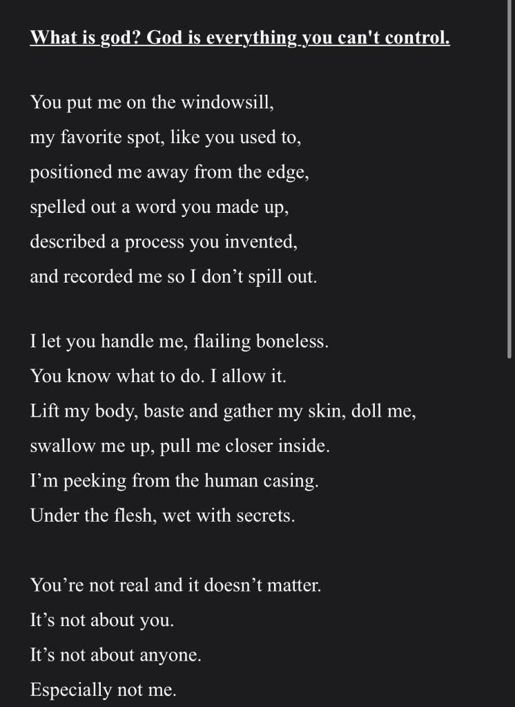 What is god? God is everything you can’t control. By Alexandra Naughton Share this: Click to share on X (Opens in new window) X Click to share on Facebook (Opens in new window) Facebook Like Loading...