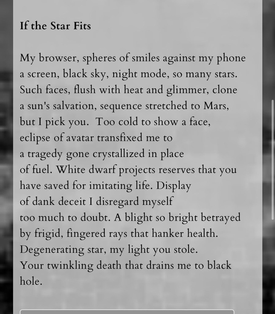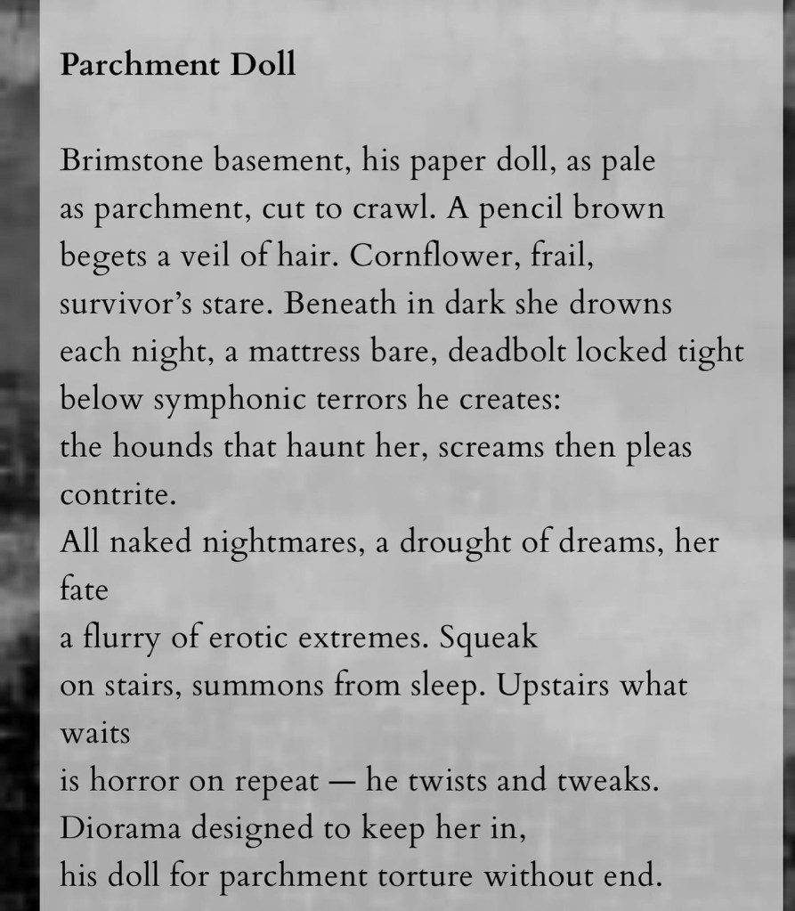 Kristin Garth is a Pushcart, Best of the Net & Rhysling nominated sonnet stalker. Her sonnets have stalked journals like Glass, Yes, Five:2:One, Luna Luna and more. She is the author of seventeen books of poetry including Pink Plastic House (Maverick Duck Press), Crow Carriage (The Hedgehog Poetry Press), Flutter: Southern Gothic Fever Dream (TwistiT Press), The Meadow (APEP Publications) and Golden Ticket forthcoming from Roaring Junior Press. She is the founder of Pink Plastic House a tiny journal and co-founder of Performance Anxiety, an online poetry reading series. Follow her on Twitter: (@lolaandjolie) and her website kristingarth.com