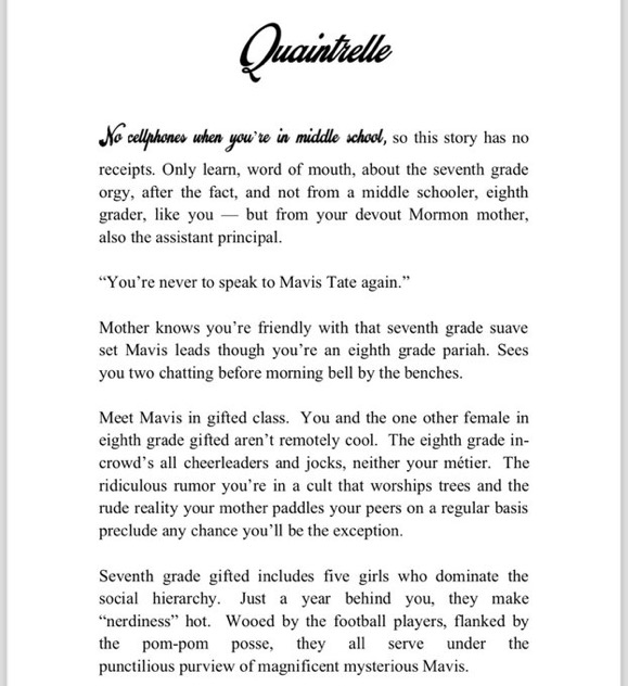 The beginning of my short story Quaintrelle about an eight grade nerd who becomes friends with the most popular girl in the seventh grade who encourages her liberation from her puritanical upbringing — until mommy finds out. This story is a part of my collection DADDY.