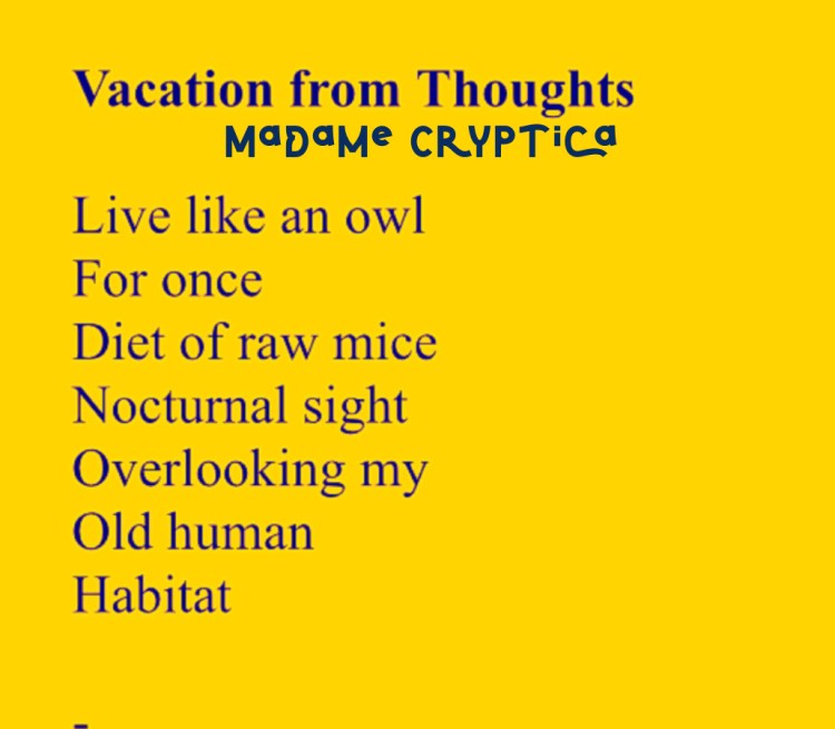 Vacation From Thoughts by Madame Cryptica Share this: Click to share on X (Opens in new window) X Click to share on Facebook (Opens in new window) Facebook Like Loading...